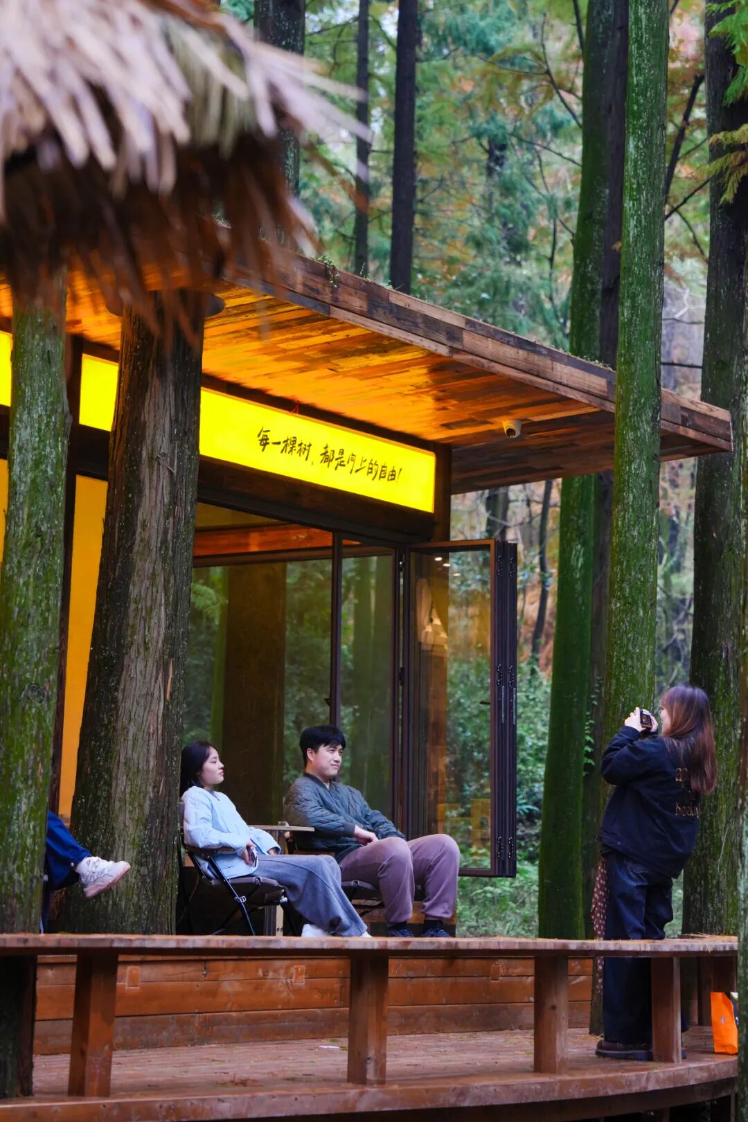 游客坐在木质长椅或草坪蒲团上